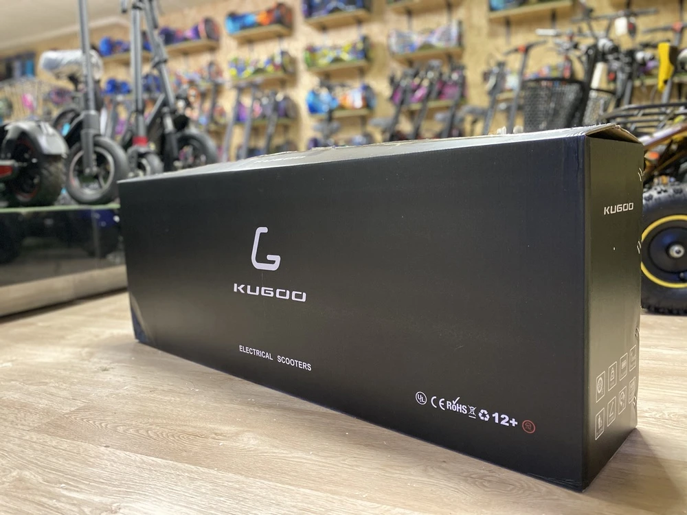 4. Фирменная коробка – электросамокат Kugoo упакован в оригинальную черную коробку. Фальшивки продаются в обычных картонках.