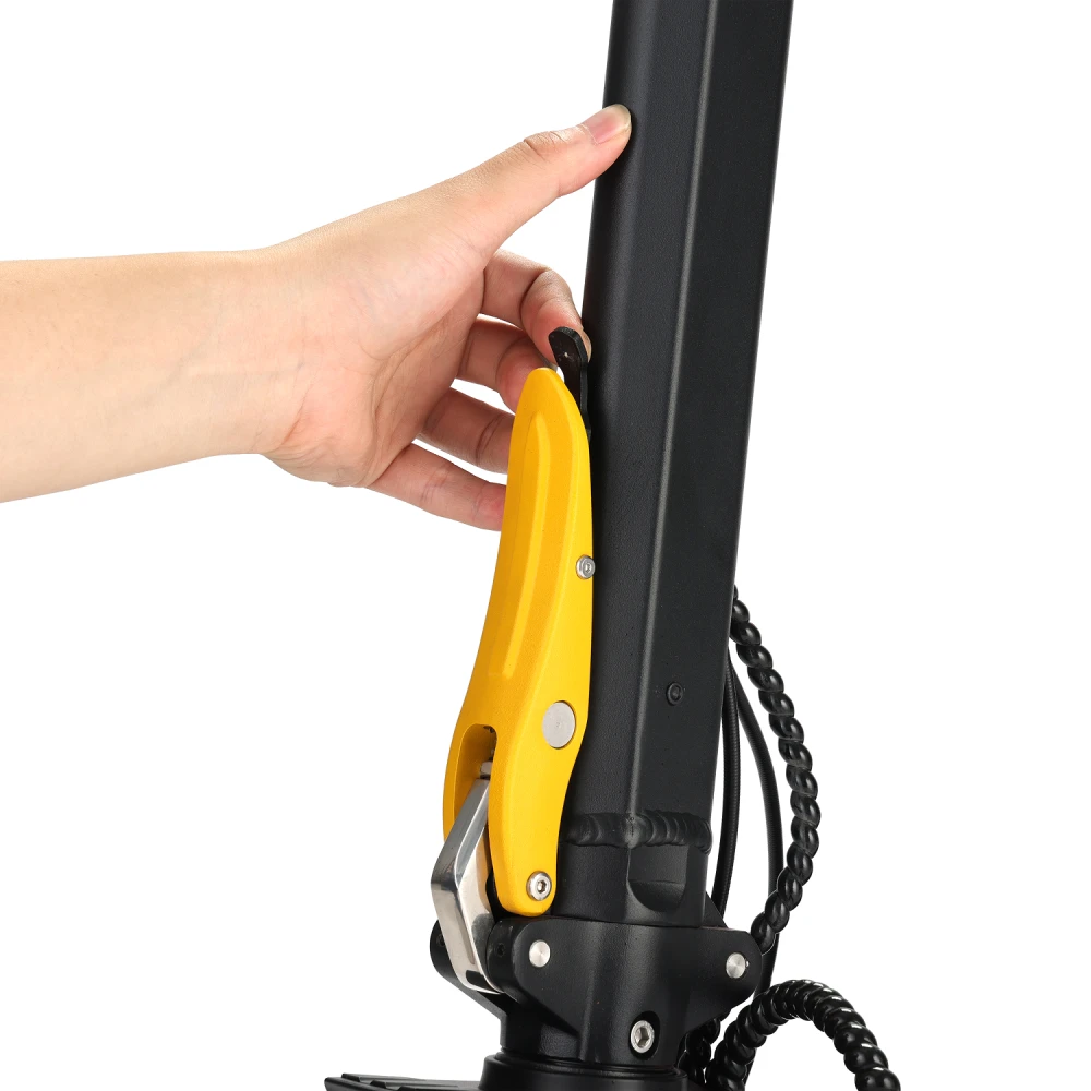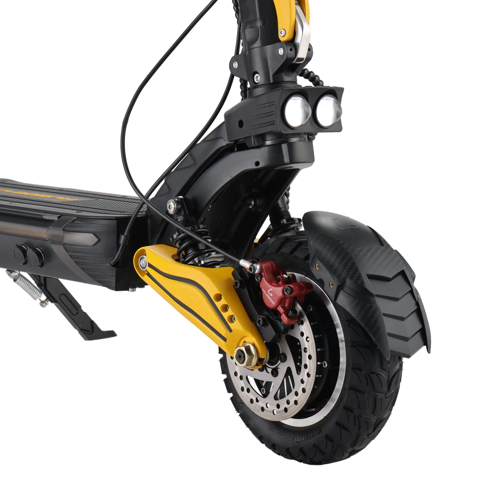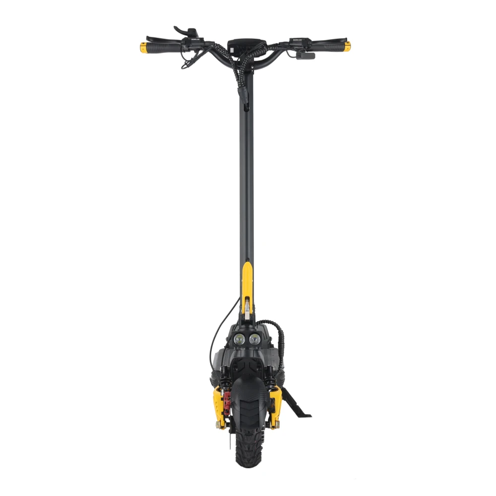 Двухлинзированная фара не только делает езду безопасной в темное время суток, но и добавляет стильный акцент к дизайну. Черно-желтая расцветка придает самокату современный и динамичный вид.