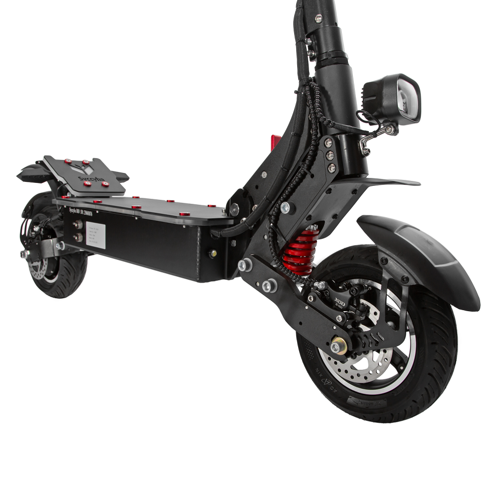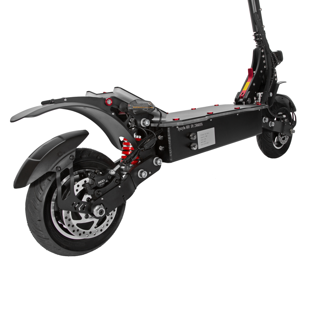Syccyba M10 Lite обладает усиленной алюминиевой рамой, задним приводом и пневматическими колесами диаметром 10–12 дюймов, что улучшает проходимость и комфорт. Модель оснащена передними и задними гидравлическими дисковыми тормозами, обеспечивающими эффективное торможение. В сравнении с конкурентами в своей ценовой категории M10 Lite выгодно отличается сочетанием мощного двигателя и большого запаса хода. Среди недостатков можно отметить относительно высокий вес около 31-40 кг, что снижает мобильность при транспортировке.