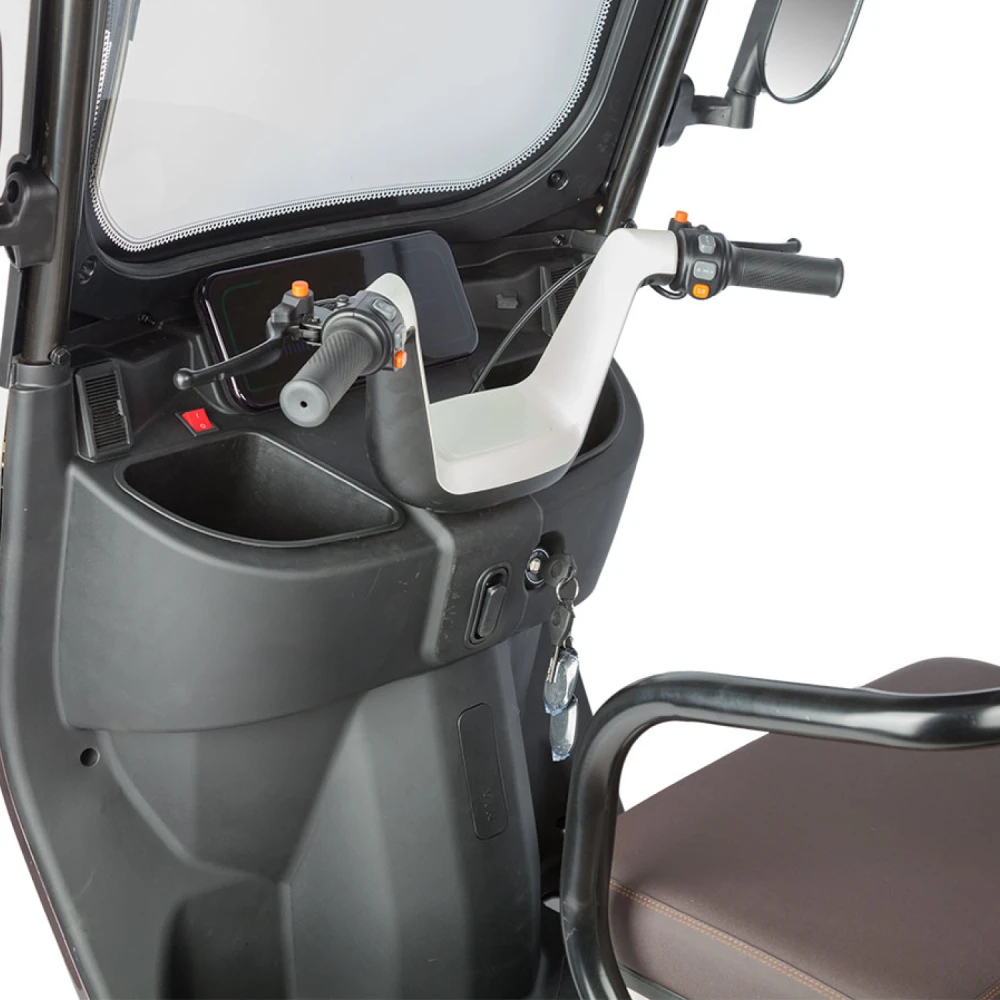 2. Модель Rutrike Gelbert Sarin — трехколесный электротрицикл с мощным двигателем 1000 Вт и возможностью выбора аккумулятора с напряжением 48 или 60 В. Это устойчивый и надежный транспорт, предназначенный для комфортного передвижения по городу и пригородам. Модель оснащена крышей и зеркалами заднего вида, что повышает безопасность и комфорт при эксплуатации.