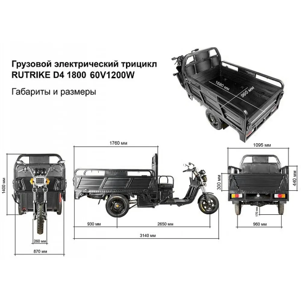 Грузовой электротрицикл Rutrike D4 1800 60V1200W в темно-сером цвете — это идеальное решение для перевозки грузов в любых условиях. Оснащенный мощным двигателем на 1200 Ватт, он развивает скорость до 25 км/ч и способен выдерживать нагрузку до 1000 кг. Трицикл оборудован дополнительным пассажирским местом, что делает его удобным не только для грузоперевозок, но и для поездок с напарником. Передняя подвеска с гидравлическими амортизаторами и задняя подвеска, состоящая из рессор, пружин и гидравлических амортизаторов, обеспечивают плавный ход и комфорт на любых дорогах. Эксплуатация возможна в любое время года благодаря всесезонной конструкции.