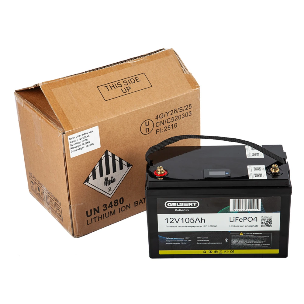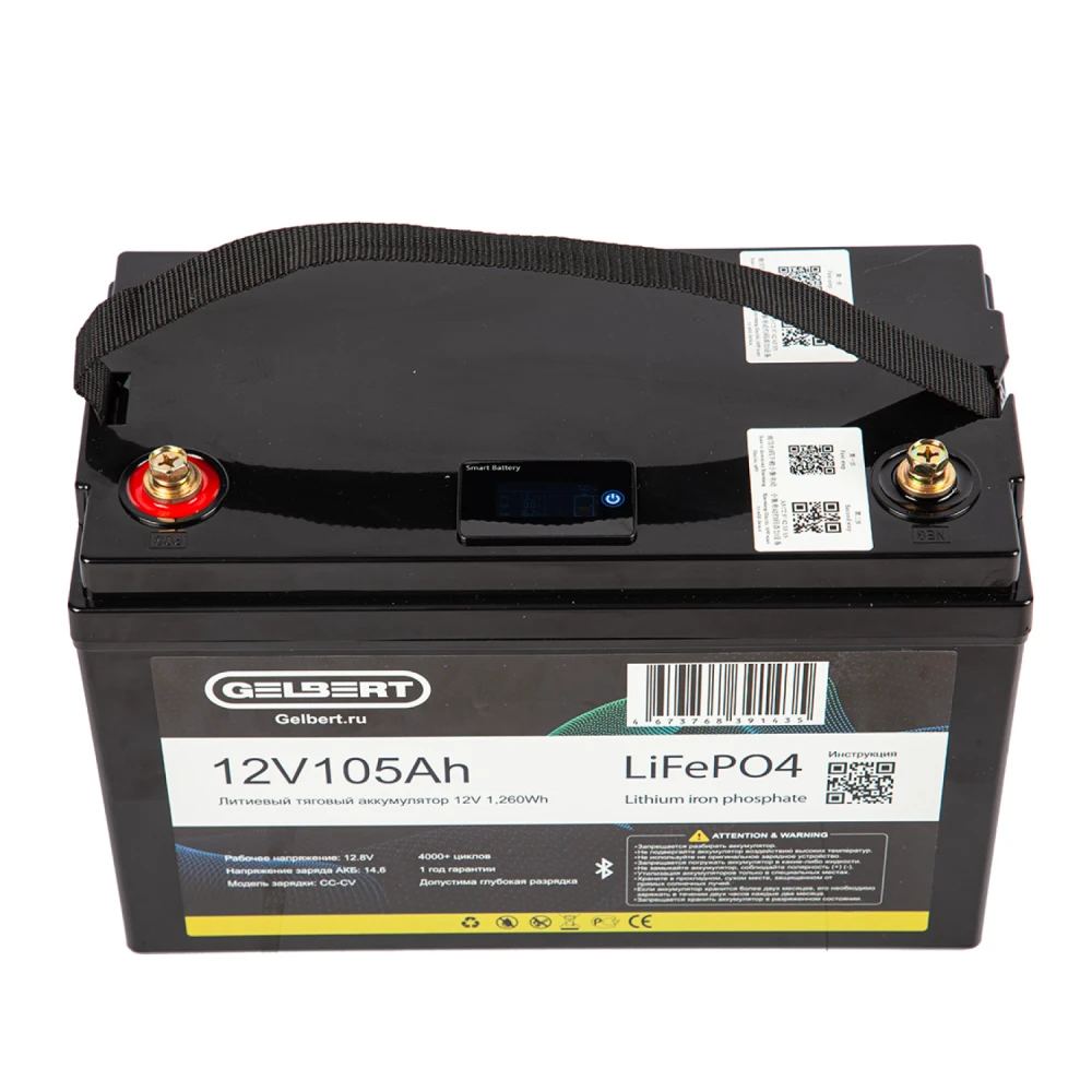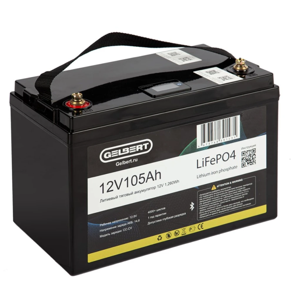 Характеристики Аккумулятор литиевый тяговый Gelbert LiFePO4 (12V/105Ah/100А/1,260Wh) Bluetooth