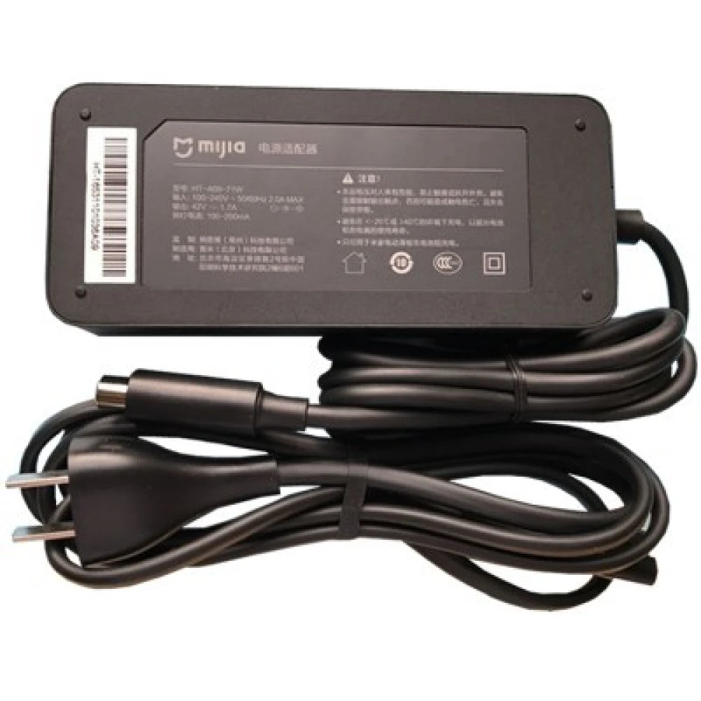 Зарядное устройство для электросамоката Xiaomi mijia М365 подходит для зарядки аккумулятора этой модели. Сила тока в нем 1.7 А, напряжение на выходе 42 вольта. Оно рассчитано на 4.5-5 часов подключения до полного заряда на 100 процентов. Выполнено из прочных материалов, с мягкими эластичными проводами, без изломов.